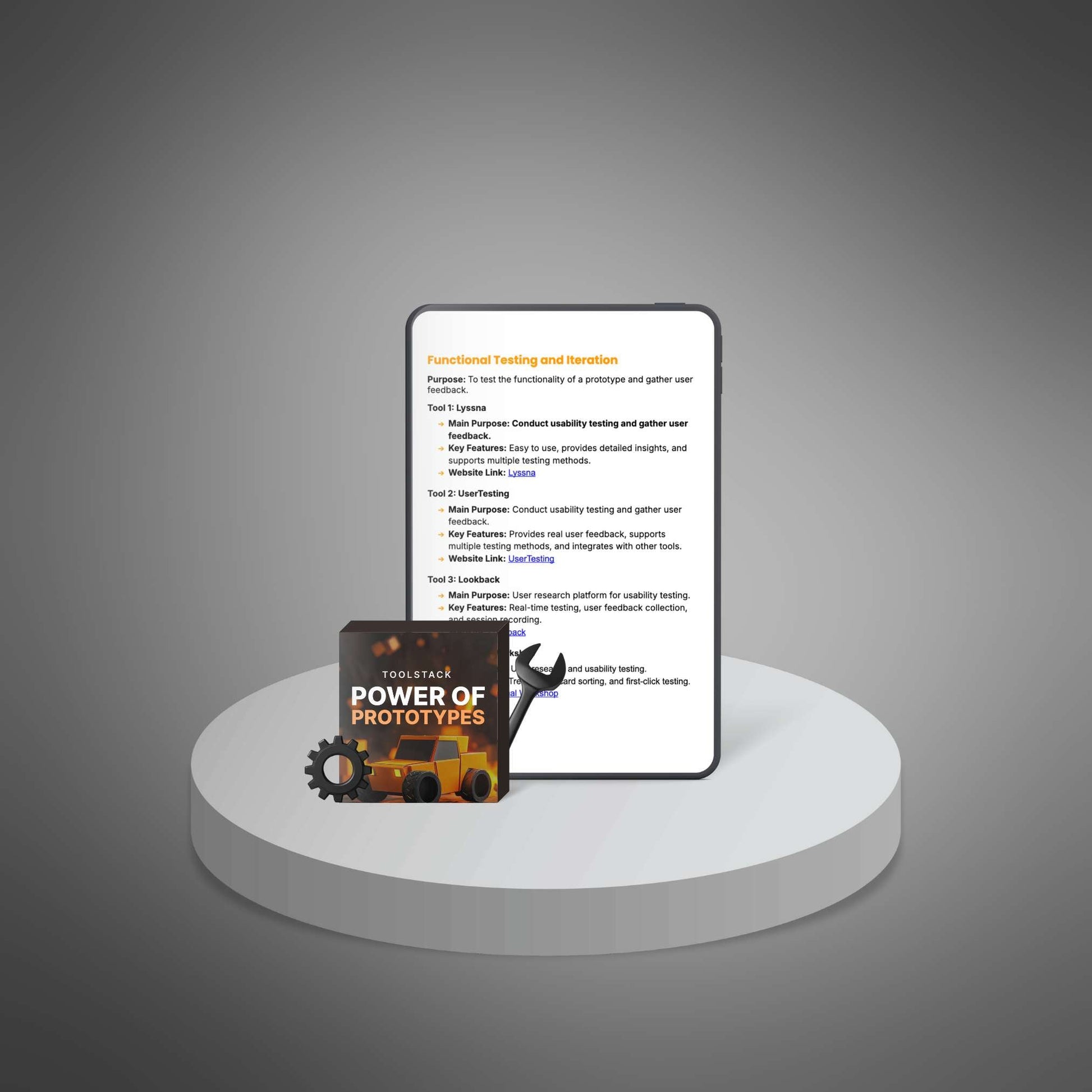 This toolstack provides your customers with a curated collection of essential resources to streamline their prototyping process. It offers a variety of tools categorized for specific prototyping tasks, from concept testing to gathering user feedback, equipping your customers with everything they need to create, test, and refine successful prototypes.